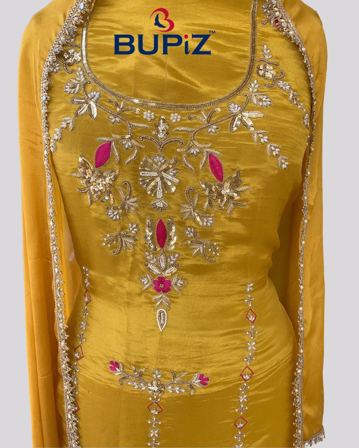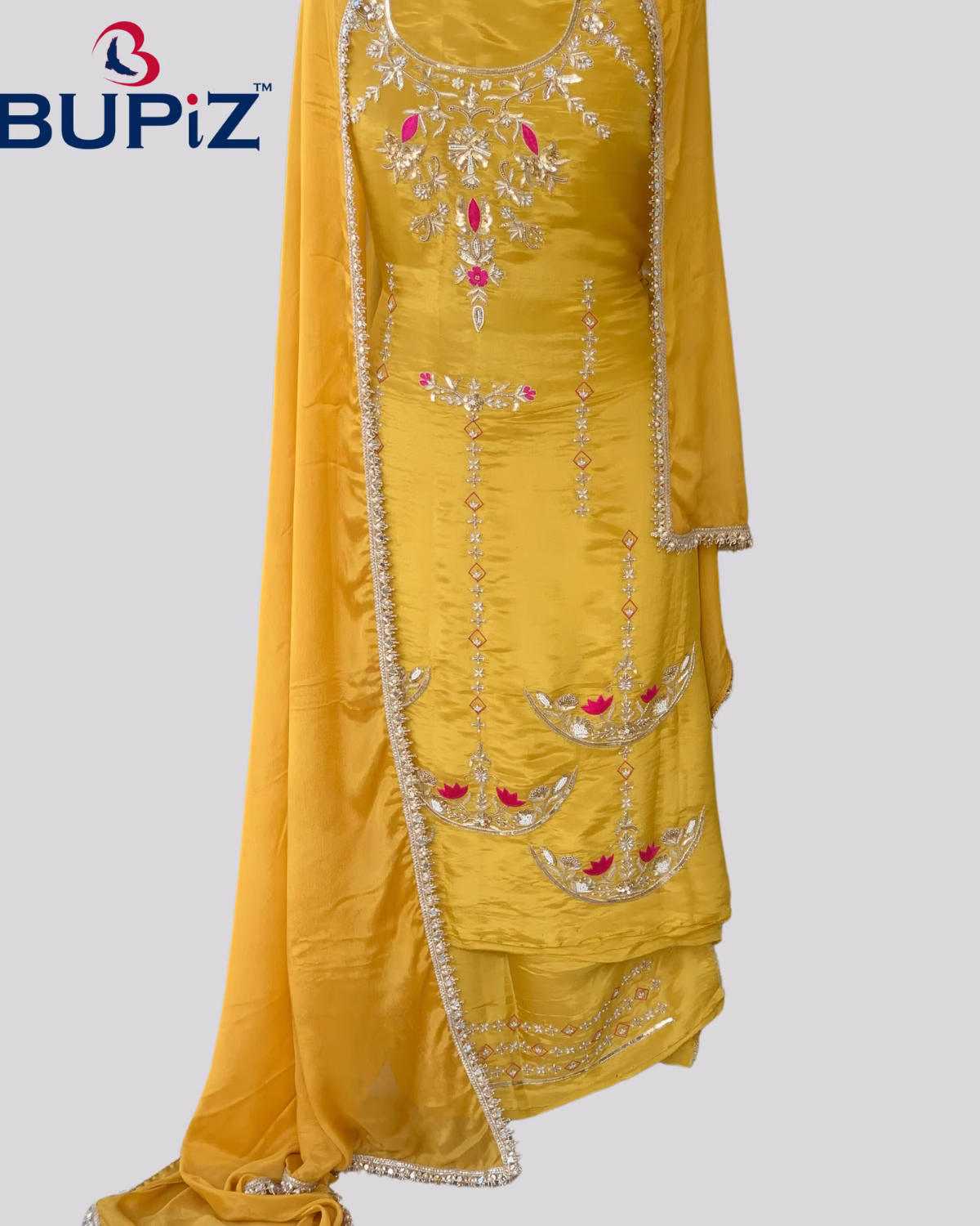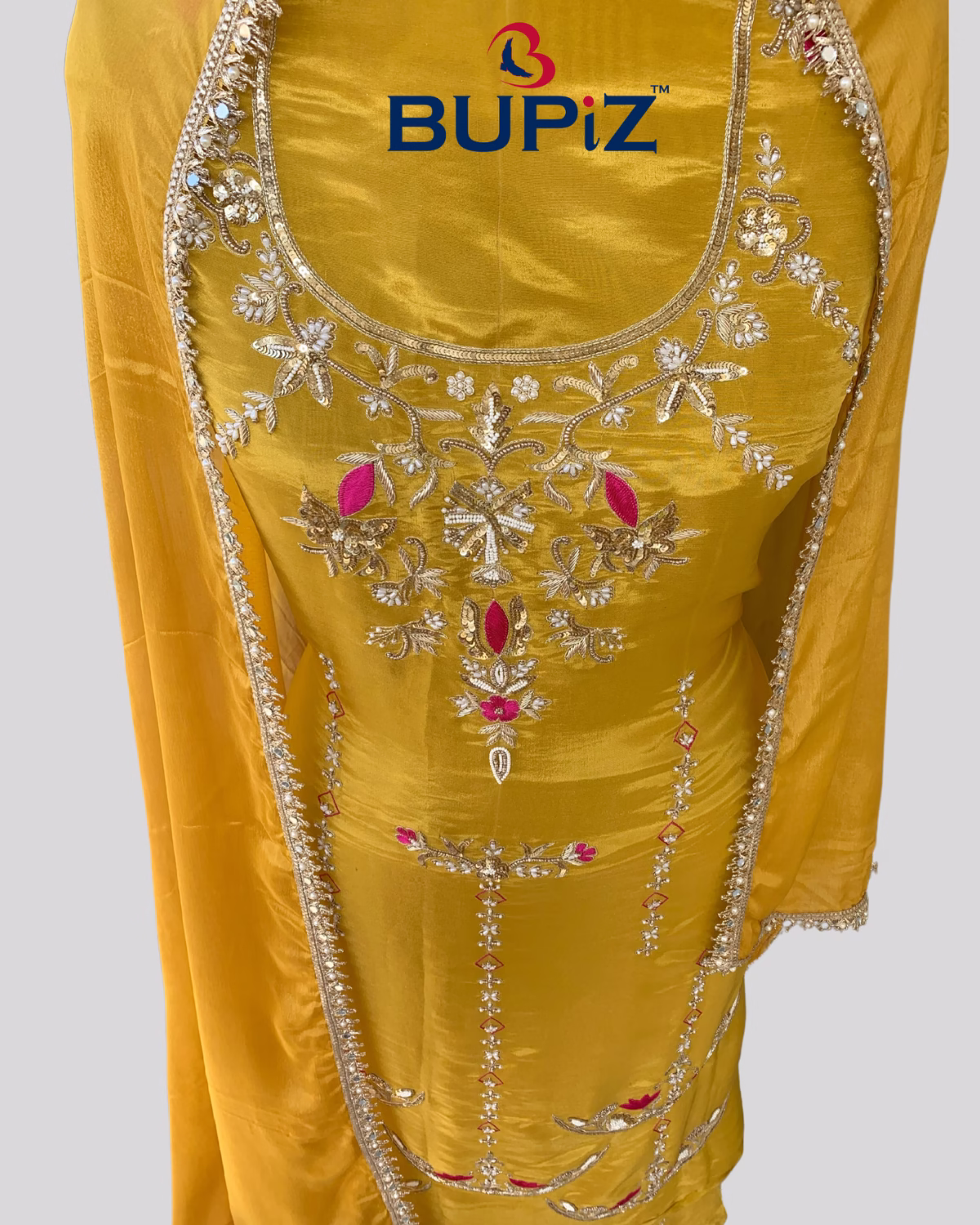 Bupiz Elegant hand Work Mustard Shimmer Silk Suit and Organza dupatta set