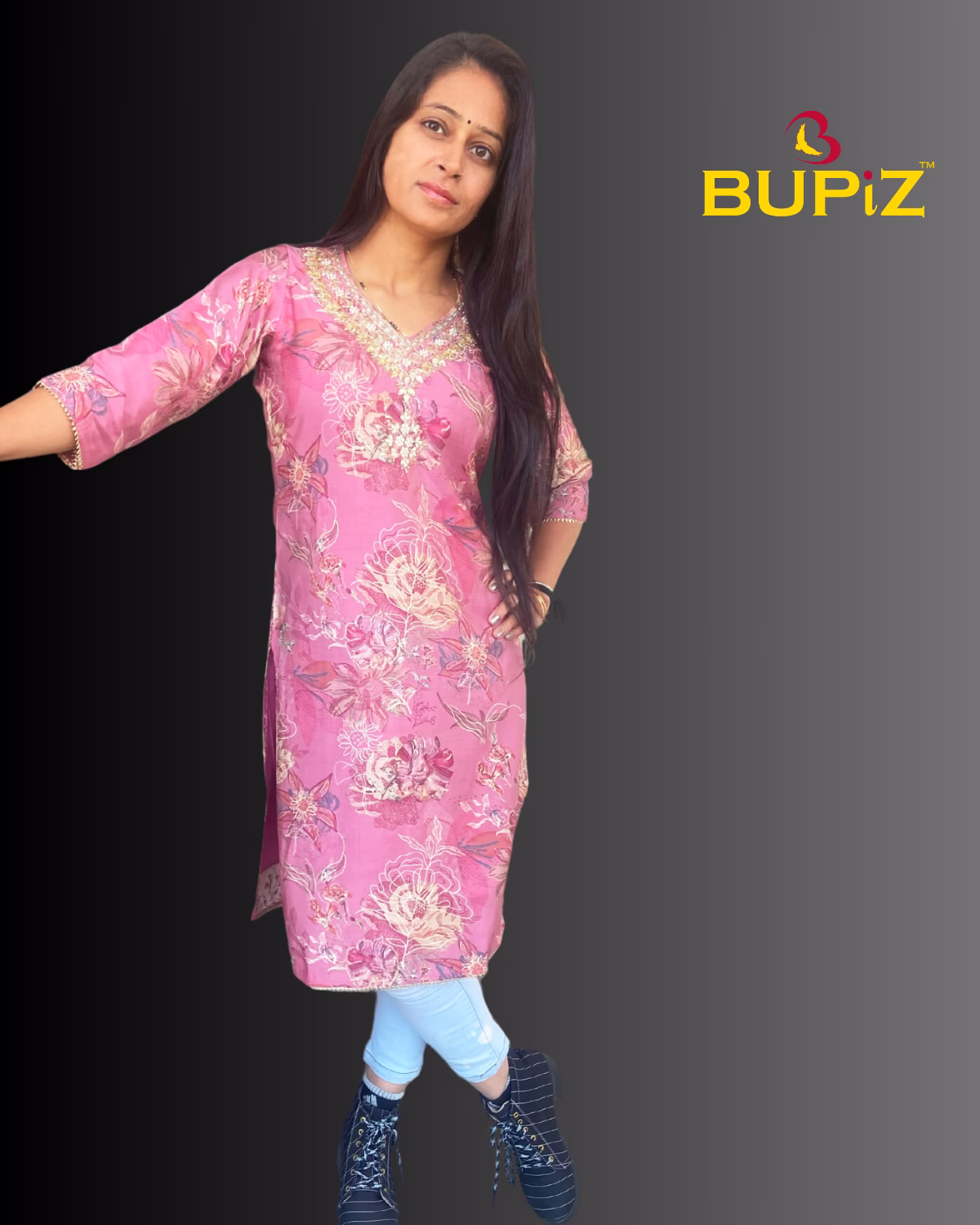 Design: The kurti features floral motifs created using foil work, and hand embroidery.