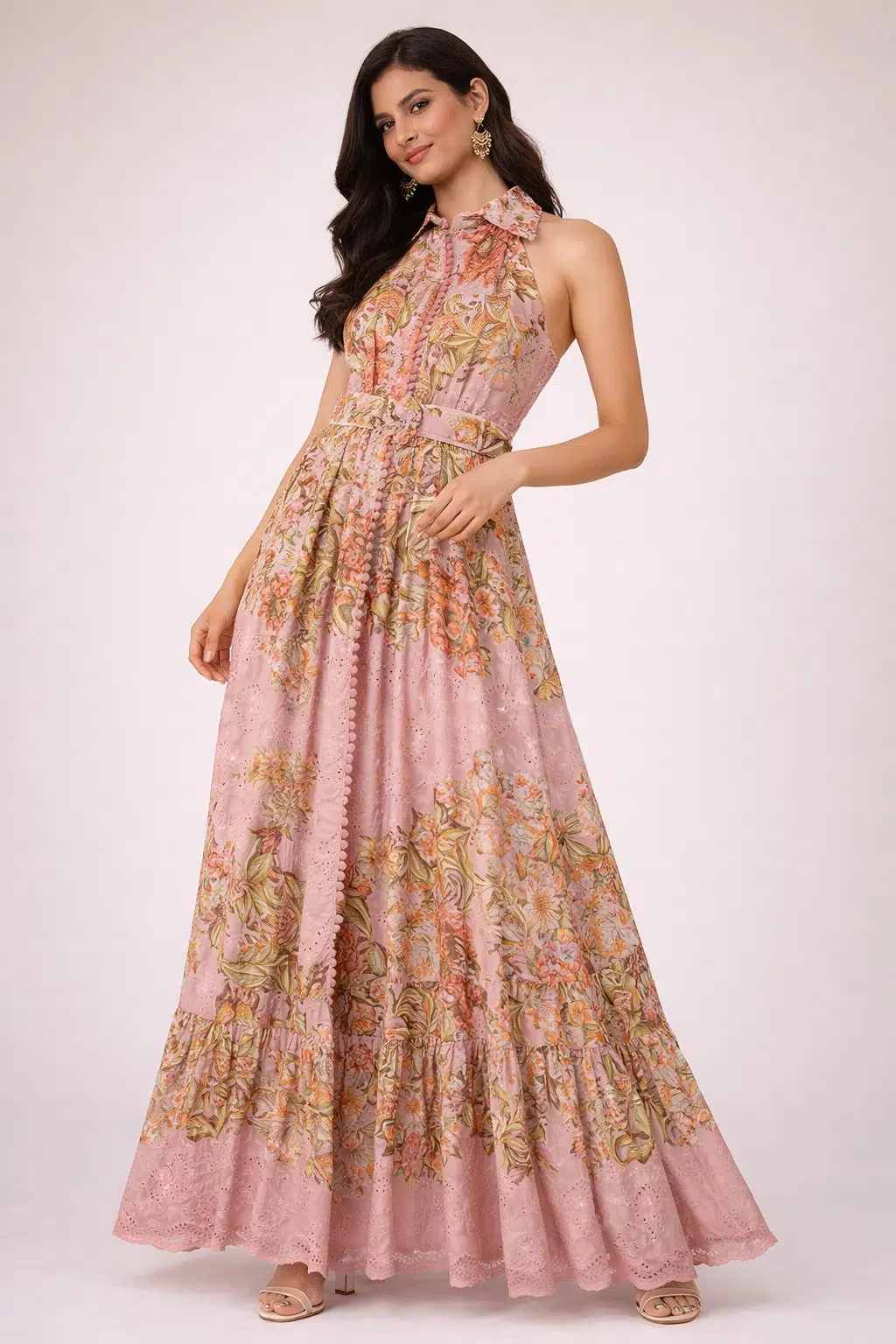 Experience maximum comfort without compromising on style. Our Schiffli cotton dress is breathable, lightweight, and features a stunning all-over eyelet design. The sleeveless halter neck and tiered hemline offer a flattering, elongated silhouette for all body types.